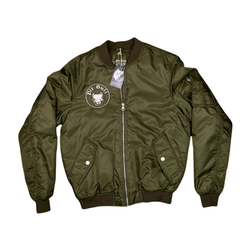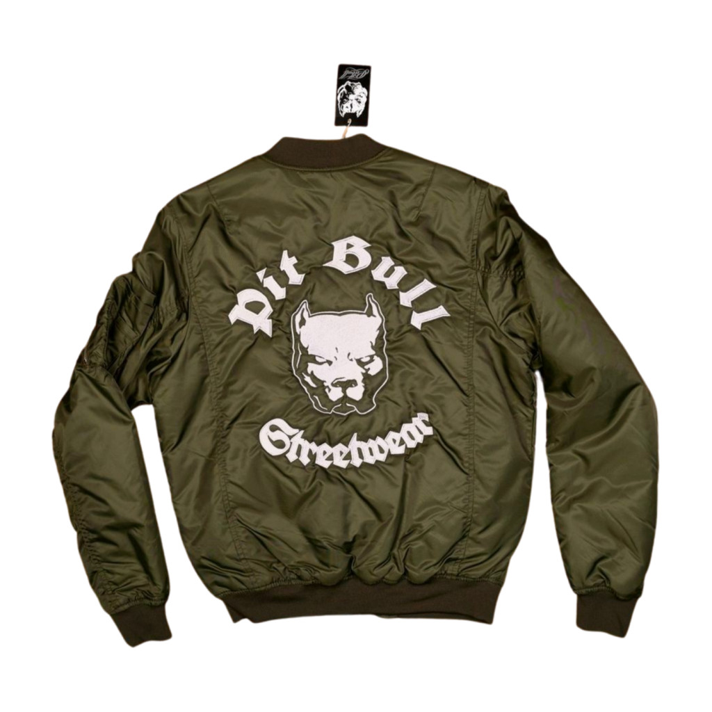 Pit Bull Streetwear – Men's bomber jacket that conveys strength, loyalty and visual determination This olive green bomber jacket is part of the Pit Bull collection, which combines the fighting spirit of the pit bull breed with street style identity. The front features a circular emblem with a pit bull head graphic, above which is the inscription "PIT BULL," while the back features the entire design in a larger size: the inscription "Pit Bull" in an arched style, with "Streetwear" in calligraphic style below.