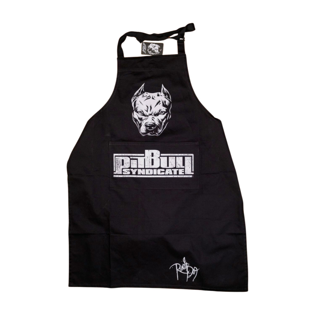 Pit Bull Syndicate – Black apron that conveys strength, uniqueness and visual determination This black apron is part of the Pit Bull Syndicate collection, which combines the fighting character of the pit bull breed with underground style identity. The chest features a detailed dog head graphic with the "PIT BULL SYNDICATE" logo underneath, while the signature motif in the bottom corner completes the design, emphasizing the distinctive look and brand loyalty.
