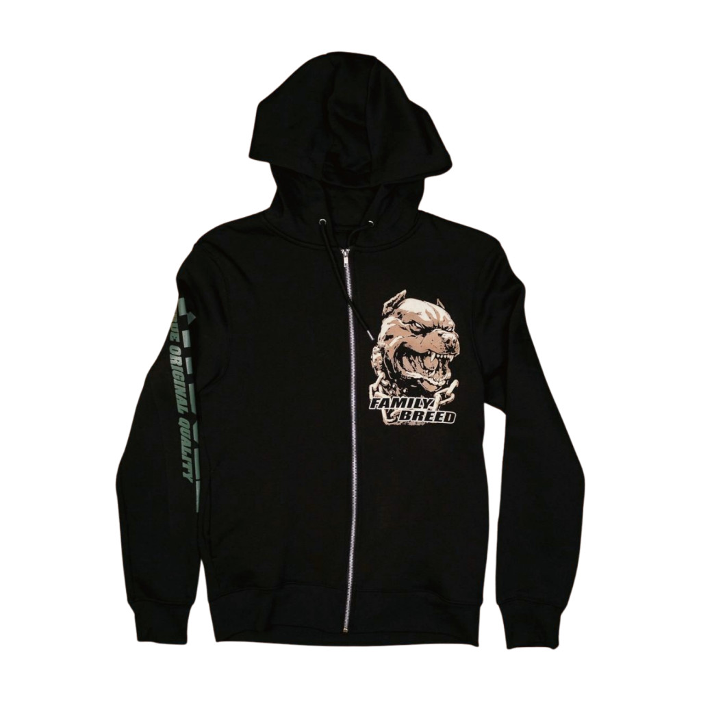 Family Breed – Men's zip-up hoodie that conveys strength, freedom and visual dominance This black hoodie is part of the Pit Bull collection, which combines the combative character of the pit bull breed with street style identity. The front features an aggressive, stylized pit bull head with the words "FAMILY BREED" underneath, while the right sleeve has the words "A DREAM QUALITY" written vertically, complemented by a geometric logo.
