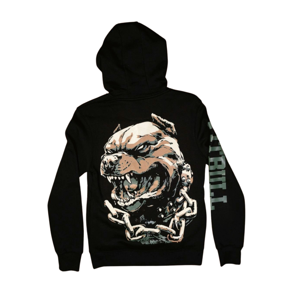 The back is dominated by a full graphic: a snarling pit bull dog tearing apart a chain, symbolizing freedom, determination, and dominance. The "PITBULL" inscription on the right sleeve further reinforces the visual message. The hoodie's comfortable cotton fabric, zipper design, practical pockets, and hood are ideal for everyday wear, street style, or sporting events.