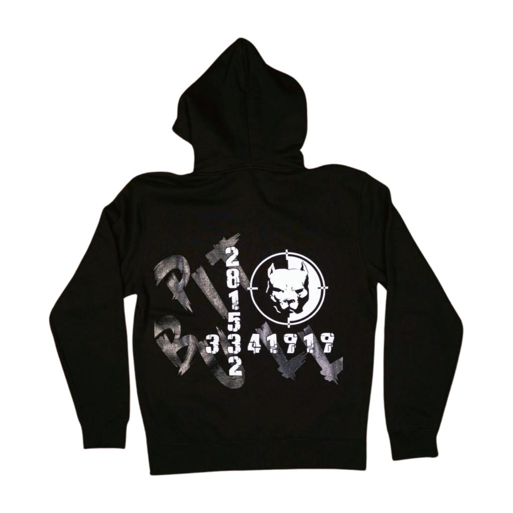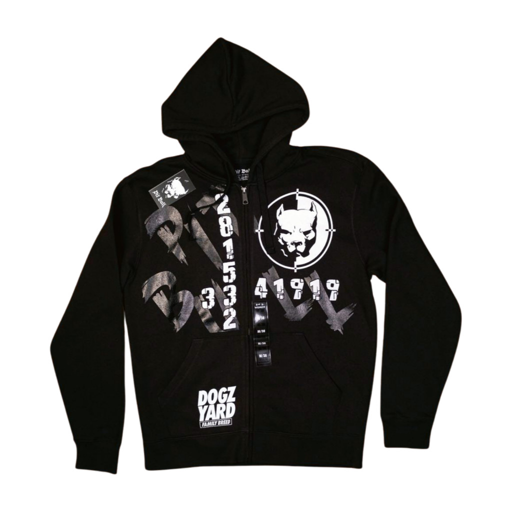 Pit Bull Dogz Yard Family – Men's zip-up hoodie that conveys punk spirit, fighting character, and visual layering This black hoodie is part of the Dogz Yard Family Brand collection, which combines the dominance of the pit bull breed with the character of underground style. The front features a crosshair dog head graphic, The numbers ("20185332" and "41818") placed vertically on both sides of the zipper act as a mysterious, coded message, while the "DOGZ YARD FAMILY BRAND" inscription in the lower left corner completes the design.
